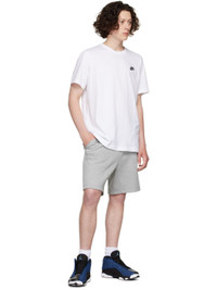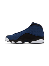 High-top paneled mesh, grained leather, and nubuck sneakers in navy and black. · Lace-up closure · Logo graphic embroidered at padded tongue · Padded collar · Iridescent green accent at side · Jersey lining in navy · Suede and canvas faced rubber midsole · Treaded rubber outsole Please note that this item may be shipped only within North America. Supplier color: Navy/University blue Upper: leather, textile. Sole: rubber.