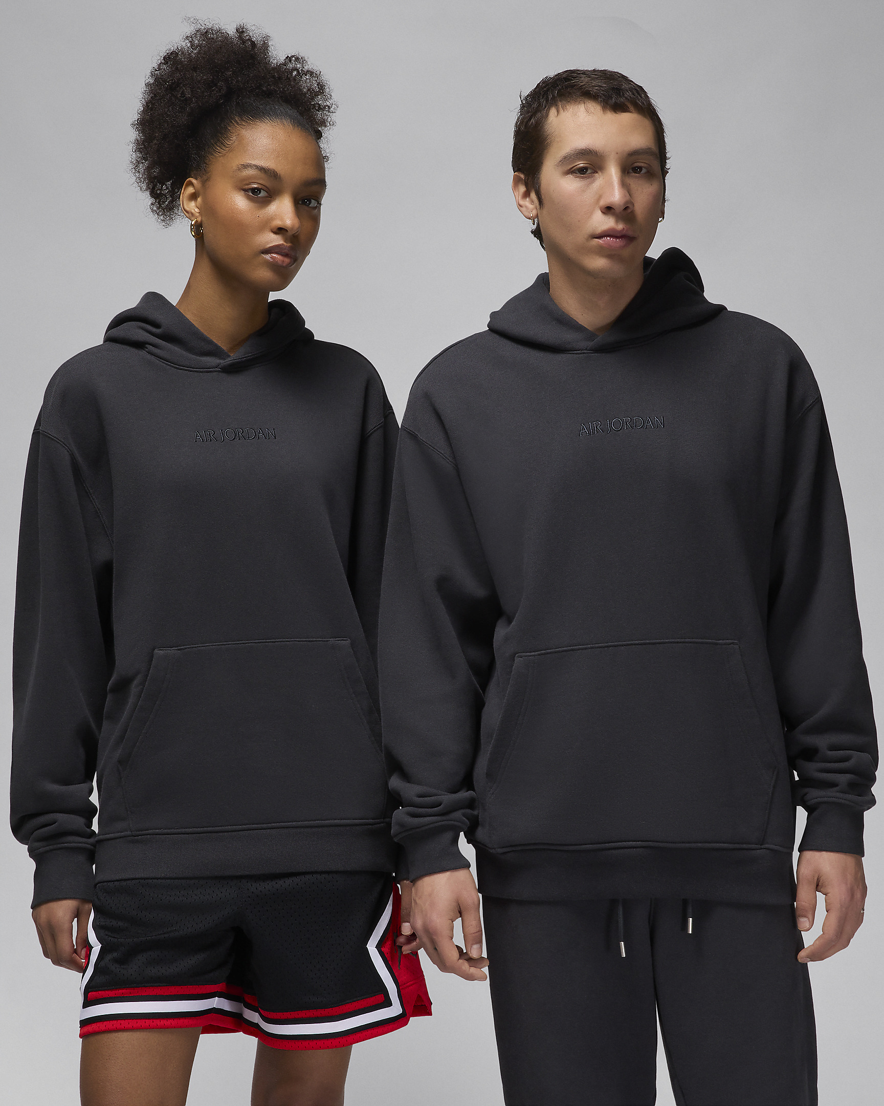 Sometimes less is more. Bundle up in this premium Jordan hoodie made from plush, heavyweight fleece. It serves straightforward quality—and the serious style your wardrobe requires. Benefits - Structured, premium fleece keeps you cozy and warm. - Front pocket is handy for small-item storage. Product Details - Body: 100% Cotton. Rib: 98% cotton/2% spandex. Hood Lining: 100% cotton. - Machine wash - Imported - Shown: Off Noir - Style: FJ1966-045 SIZE & FIT Female model is wearing size XS and is 5'10"178cm Male model is wearing size M and is 5'10"178cm Standard fit: easy and traditional If you typically wear men's styles, please select your usual size. If you typically wear women's styles, please size down. Fits large; we recommend ordering a size down