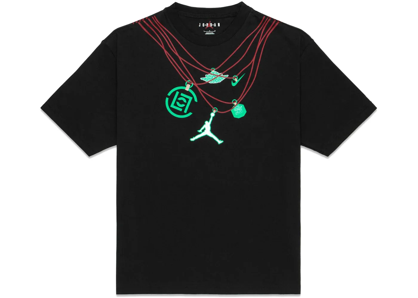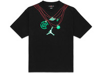 The Jordan x Clot Jade T-Shirt Black is a short-sleeved cotton t-shirt in black, printed with images of jade green pendants suspended from the red cord on the front and back. The Jumpman, Nike Swoosh, and CLOT logos are among the front pendants, while the reverse features letters that spell Jordan. Additional Nike, Jordan, and CLOT branding is printed on the back in khaki. The Jordan brand dates to the 1980s, when Nike designed sneakers for Michael Jordan during his time with the Chicago Bulls. CLOT is a Hong Kong fashion brand that collaborated with Nike to design an Air Jordan 5 Low sneaker inspired by China’s prized mineral, jade. The Jade T-shirt expands upon the aesthetic of the sneaker’s symbolic motif. In our opinion, the best feature of the Jade T-shirt is its unique and well-executed screen-printed imagery. The Jordan x Clot Jade T-Shirt Black was released for Spring/summer 2022 and retailed for $47. - Season SS22 - Color Black - Retail Price 47 - Featured false