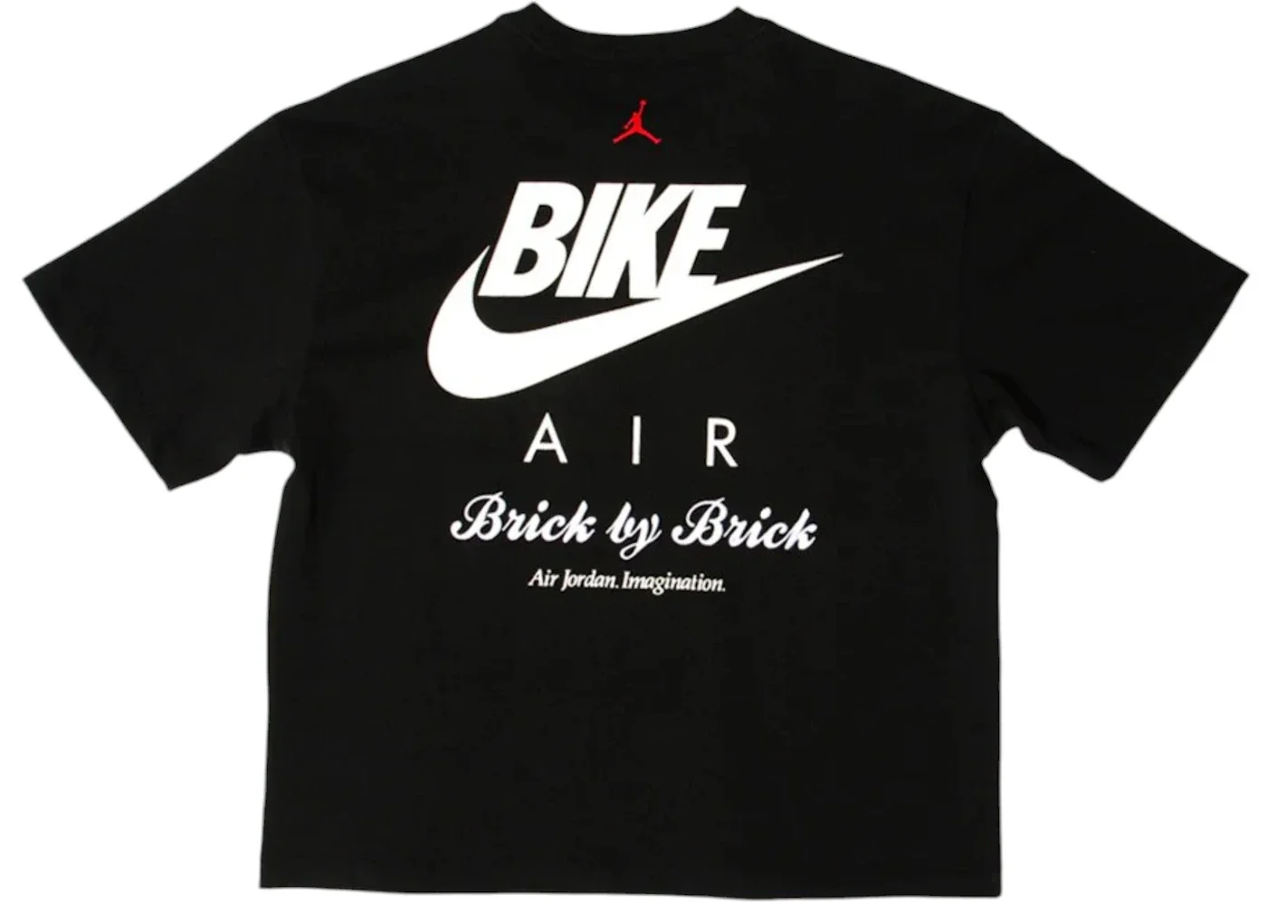 The Jordan x Nigel Sylvester Brick Tee Black is a short-sleeved t-shirt designed by American BMX athlete Nigel Sylvester. This iteration of the Jordan x Nigel Sylvester Brick Tee is black, which dominates most of the design. The front of the shirt features a small red Jumpman logo above the words "Air Jordan. Imagination." in white text. The back of the shirt features a larger design, with the traditional Nike branding being changed to "BIKE" in white text to honor the BMX athlete. This dual branding is combined with a white Nike Swoosh and Air branding, along with the words "Brick by Brick" and "Air Jordan. Imagination." once again in white text. A small red Jumpman logo is seen just under the collar. Our favorite thing about this t-shirt is the creative take on the Nike branding to incorporate the BMX element on the back. The Jordan x Nigel Sylvester Brick Tee Black was released on March 14, 2025, for $55. - Season SS25 - Color Black - Release Date 2025-03-14 - Style HQ1736-010 - Retail Price 55 - Featured false - Requester Kelsey K - Uploaded By LL