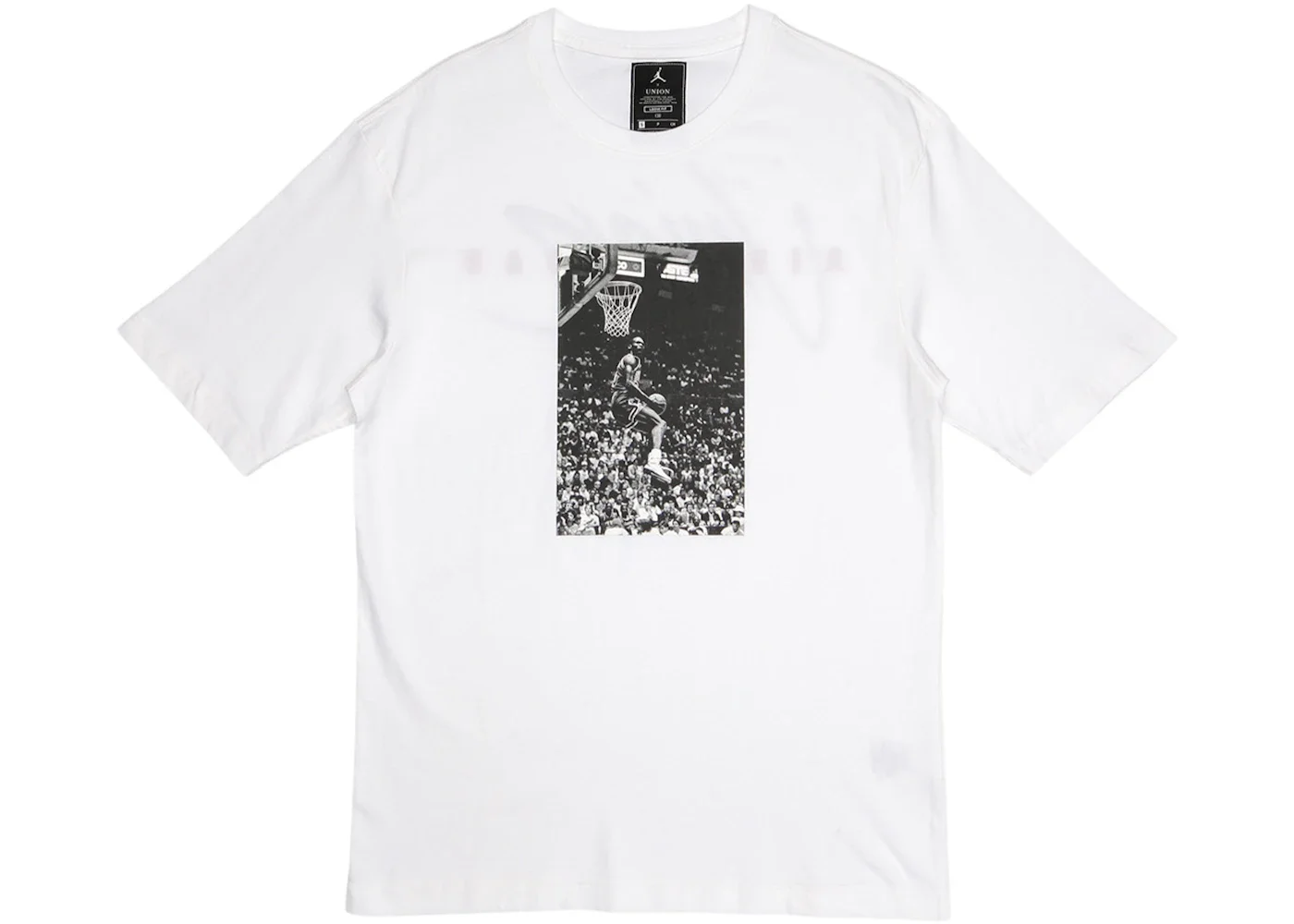 The Jordan x Union Reverse Dunk T-shirt White combines elements from Nike’s Jordan line and Union’s streetwear aesthetics. It features a minimalist Jordan x Union emblem on the back and a stylized Dunk graphic of Michael Jordan on the front in contrasting black and white tones. The white Dunk T-shirt by Jordan x Union Reverse is made of high-quality cotton. Its front displays a stylized Dunk graphic of Michael Jordan, while the back showcases a minimalist Jordan x Union emblem. Union, founded in 1989, is known for blending street culture with fashion, often partnering with Jordan for limited-edition collaborations like this one. Our experts love the ribbed crewneck collar, which offers durability over time, and the soft, pre-shrunk cotton fabric, which minimizes shrinkage after washing. These practical details add long-lasting wearability to the shirt. Released on August 29, 2020, the Jordan x Union Reverse Dunk T-shirt White retailed at $50. - Season FW20 - Color White - Release Date 2020-08-29 - Retail Price 50 - Featured false