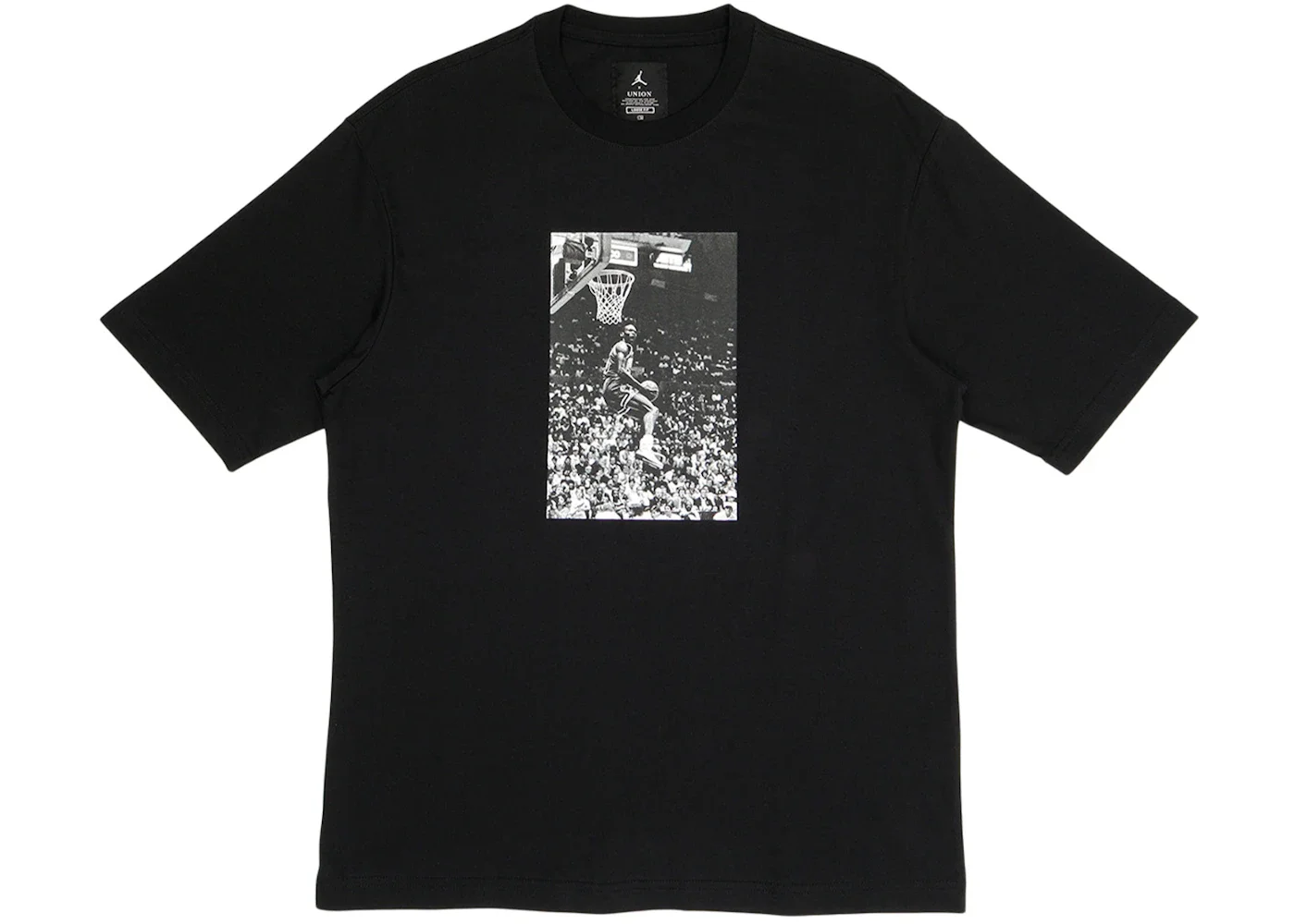 The Jordan x Union Reverse Dunk T-Shirt Men's Black was made available as part of the collaborative work of Air Jordan and Union in honoring Michael Jordan’s Airness and gravity-defying skills on the basketball court. The release comes in black. The Jordan x Union Reverse Dunk T-Shirt Black features Michael Jordan throwing down a double-handed reverse dunk as the immortalized feature of this signature. The front and center of this T-shirt are decorated with black and white images. Meanwhile, the LA-based labels can be found across the back, giving this black cotton tee an off-court look. What we highlight about the Reverse Dunk T-Shirt in Black is the heavy cotton tee with a classic feel and look. The tee's fabric is laundered to reduce its shrinkage effect. The Jordan x Union Reverse Dunk T-Shirt Men's Black was released at a retail price of $50 on August 29th, 2020. - Season FW20 - Color Black - Release Date 2020-08-29 - Retail Price 50 - Featured false