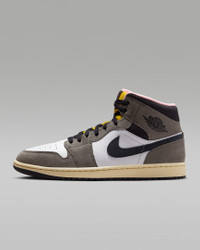 Inspired by the original AJ1, this special mid-top edition maintains the iconic look you love while choice colors and a fresh mix of materials gives it a distinct identity. Benefits - Genuine leather in the upper adds durability, structure and a premium feel. t - Nike Air technology absorbs impact for cushioning with every step. - Soft foam midsole helps provide lightweight cushioning. - Rubber outsole adds durable traction. Product Details - Jumpman on tongue - Wings logo on collar - Shown: White/Cave Stone/Dark Sulfur/Oil Grey - Style: HQ2011-100