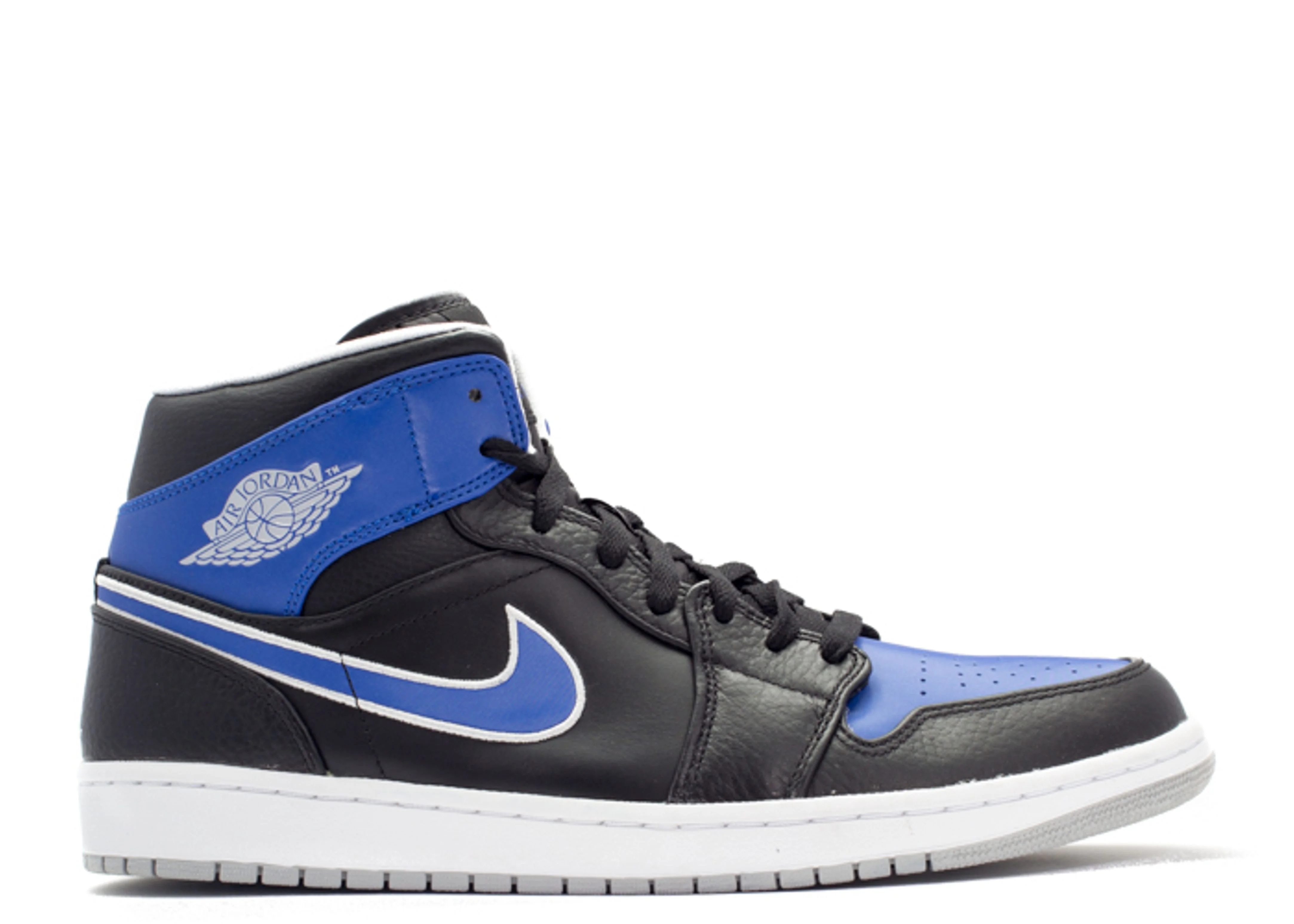 The Air Jordan 1 Mid 'Orlando Magic' gives the nod to the team that defeated Michael Jordan and the Bulls in the 1995 NBA Playoffs. The shoe's black leather upper is complemented by Game Royal on the toe box, Swoosh and collar. Contrasting white appears on the lining and Swoosh outline, matched underfoot by the white midsole. The insole sports 'Formidable Foes.' SKU: 554724 007 Colorway: Black/Metallic Platinum-Game Royal Release Date: 6/30/13