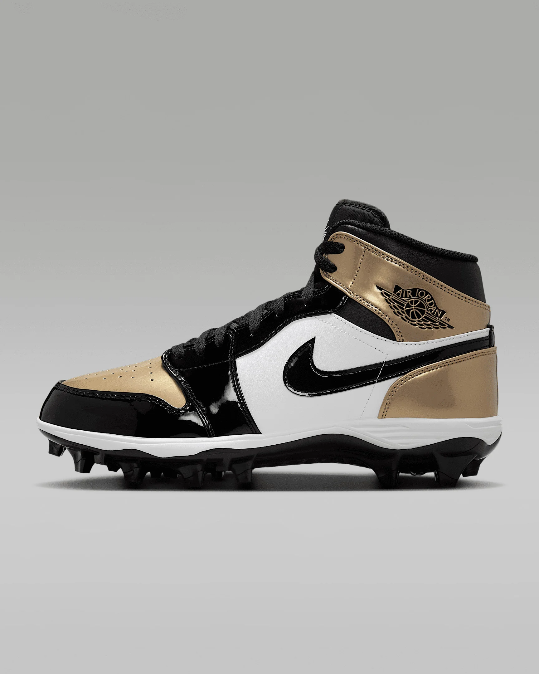 Engineered for speed, the Jordan 1 Mid TD offers a new degree of agility and quickness. Its wide stud placements help you cut faster than ever before. And the durable design is backed by synthetic leather details in the upper that help resist abrasion. Benefits - Upper takes the best parts of the AJ1 and reimagines the silhouette for a football cleat. - Wide stud placement helps you make quick cuts on the field. - External midsole provides extra comfort. Product Details - Shown: Metallic Gold/White/Black - Style: FJ6805-701