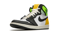 The Air Jordan 1 High “Volt Gold” is a “do-it-yourself” inspired colorway of Michael Jordan’s first signature shoe that was released by Jordan Brand in early 2021. Crafted in the spirit of Off-White and Virgil Abloh’s deconstructed Air Jordan 1s from the coveted “The 10” collection, the “Volt Gold” features contrasting hues of neon yellow and gold on its design, as well as "overcut" leather panels that extend past the stitching. White leather can be found on the perforated toe and mid-panel. Contrasting black leather appears on the forefoot, toe cap, and eyelets. A black “Wings” logo can be found on the Volt collar overlay and a black Swoosh appears on either side of the shoe. Additional details include a gold leather panel on the heel, cream shoe laces, and a vintage-inspired cream midsole. An inverted orange-tinted translucent “Nike Air” tongue tag appears on the cream nylon tongue. Release date: January 9, 2021.