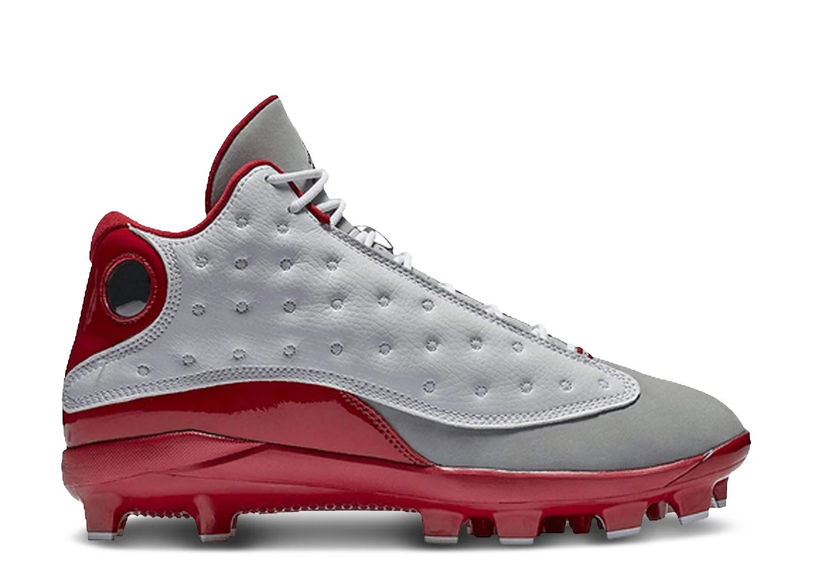 Introducing a baseball cleat version of the iconic Air Jordan 13 Retro, the Air Jordan 13 Retro MCS 'Grey Toe' showcases a stylish adaptation of the silhouette designed specifically for the diamond. Launching just in time for the MLB playoffs in September 2018, this cleat features premium details including a leather upper, red patent leather highlights and grey suede accents on the toe box. The recognizable silhouette is complemented by a molded MCS outsole, ensuring optimal traction and performance on the baseball field. SKU: AJ8016 126 Colorway: White/Gym Red Release Date: 10/1/18