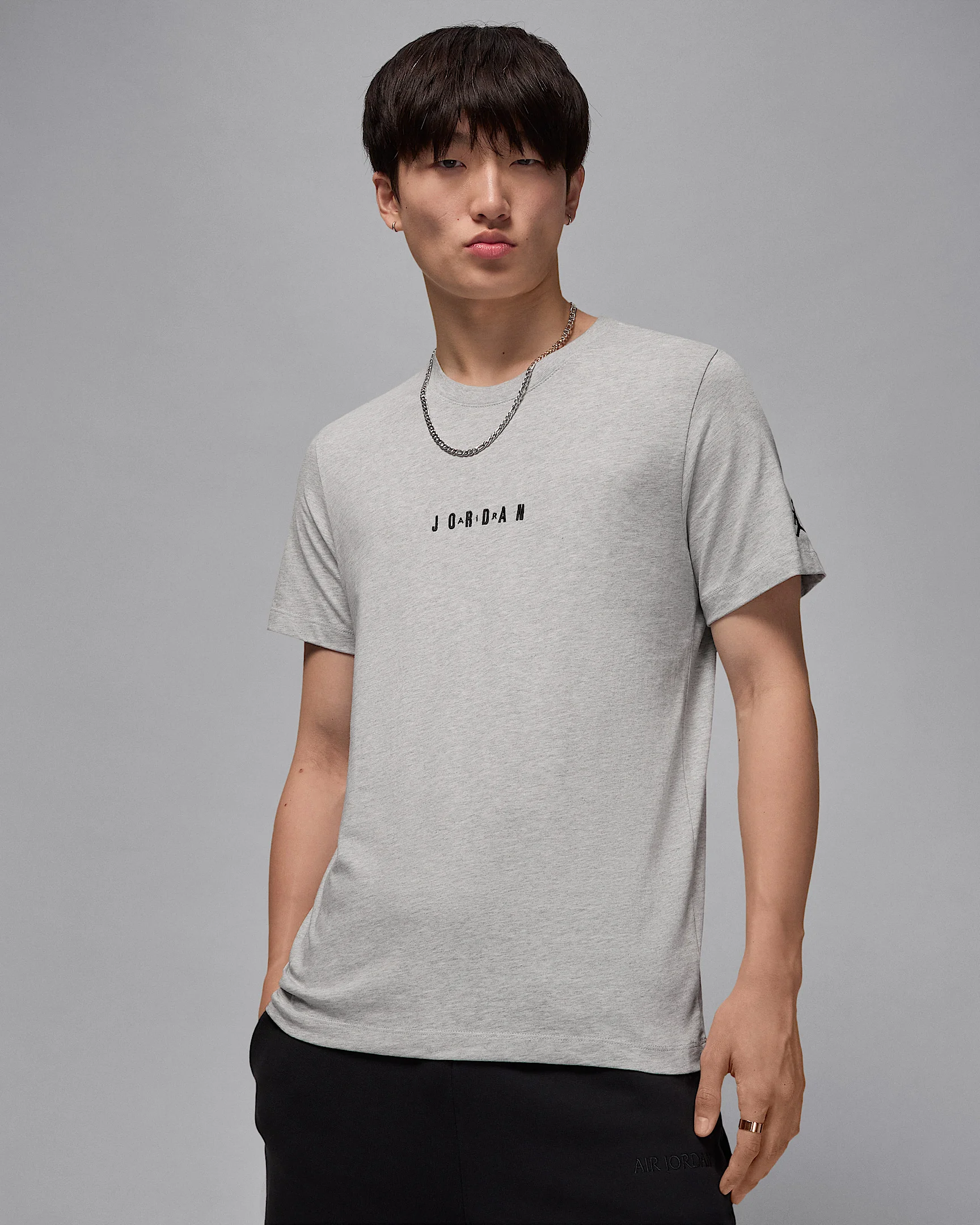 This all-cotton Jordan tee features a minimal, embroidered graphic across the chest. A relaxed fit and monochromatic look make it an easy choice. Product Details - Jordan Standard fit - Ribbed collar - Embroidered graphic - 100% cotton - Machine wash - Imported - Shown: Grey Heather/Black - Style: DM3182-050 SIZE & FIT Model is wearing size M and is 6′4″193cm Standard fit: easy and traditional