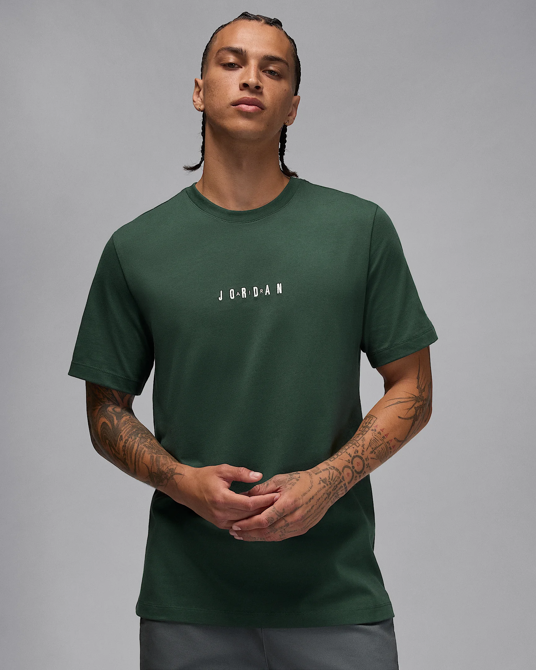 This all-cotton Jordan tee features a minimal, embroidered graphic across the chest. A relaxed fit and monochromatic look make it an easy choice. Product Details - Jordan Standard fit - Ribbed collar - Embroidered graphic - 100% cotton - Machine wash - Imported - Shown: Midnight Green/Sail/Sail - Style: DM3182-316 SIZE & FIT Model is wearing size M and is 6′0″183cm Standard fit: easy and traditional