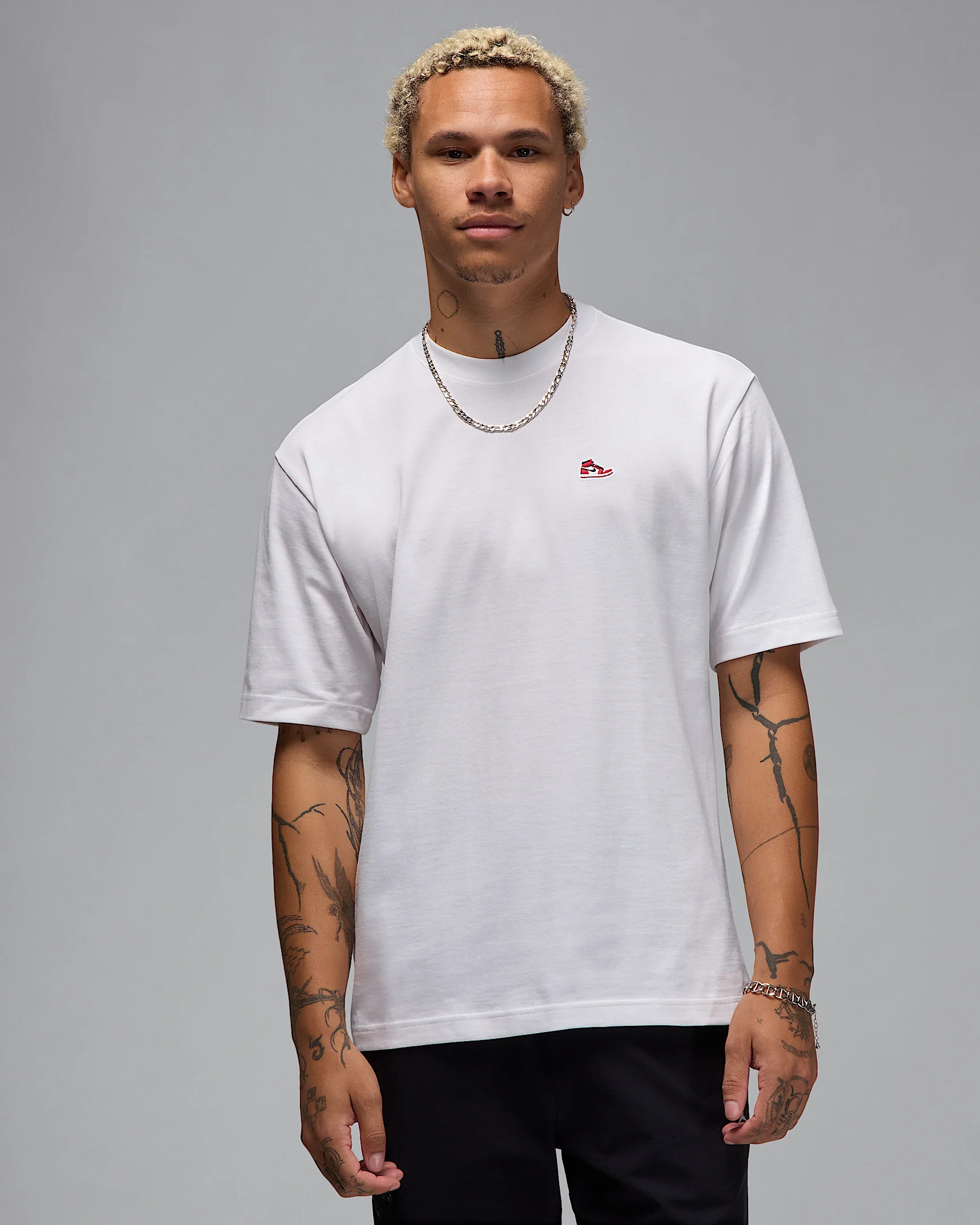 Let's cut to the chase—sometimes the AJ1 is all you need. Especially when it's sewn on a structured heavyweight cotton tee. Product Details - 100% cotton - Machine wash - Imported - Shown: White/Varsity Red - Style: HJ2326-100 SIZE & FIT Model is wearing size M and is 6′1″185cm Standard fit: easy and traditional