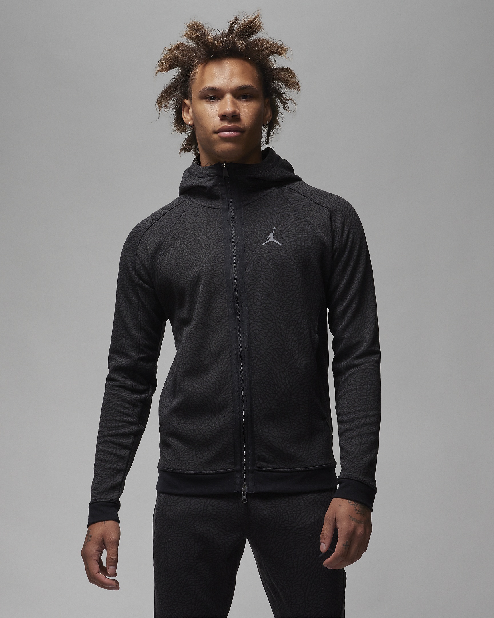 Whether you're playing a game or hanging in the bleachers watching one, you're good to go in this full-zip hoodie. It's made with sweat-wicking material so you stay feeling fresh. And with that all-over elephant print, do we need to say anything else? Benefits - Nike Dri-FIT technology moves sweat away from your skin for quicker evaporation, helping you stay dry and comfortable. - Zippered pockets keep your belongings secure. - Ribbed cuffs and hem help keep out the elements. Product Details - Body: 78% polyester/22% cotton. Hood Lining: 78% polyester/22% cotton. - Machine wash - Imported - Shown: Black/Dark Shadow/Dark Grey - Style: FD8119-010 SIZE & FIT Model is wearing size M and is 6′1″185cm Sm fit: sleek and tailored