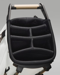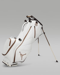 Hit the green with the right gear. From top to bottom, the Jordan Golf Bag has everything you need to knock in that hole-in-1. From its extensive 6-way divider system to the Air Jordan-inspired touches made to hold your towel and umbrella, you'll be carrying the bag that will help level up your day on the course. More Benefits - Matching rain hood helps keep your gear dry. - Air Jordan 14-inspired towel ring allows you to access your golf towel easily. - Air Jordan 6-inspired lace-lock umbrella cinch allows you to play in inclement weather. Product Details - Weight: 7.05 lbs - Body: 85% synthetic leather/15% polyester. Lining: 100% polyester. - Spot clean - Imported - Shown: Photon Dust/Light Smoke Grey/Olive Grey - Style: J1008926-017
