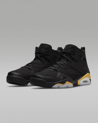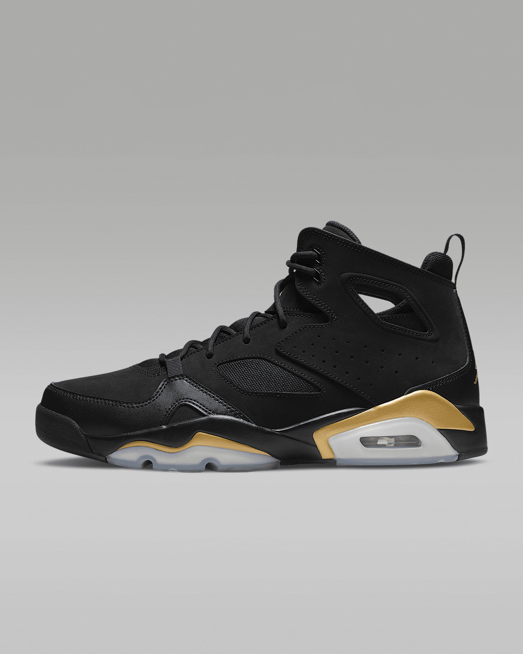 The Jordan Flight Club '91 has a design that throws back to basketball's golden age and the sneakers that reigned supreme. The Air Jordan 6 is the muse, with visible Air cushioning, cutouts in the collar, and a windowed tongue reminiscent of MJ's classic game shoe. The 91 has a structured frame of genuine and synthetic leather containing an inner bootie, providing a snug and secure fit. Benefits - Genuine and synthetic leather in the upper for durability, structure and support. - Inner knit bootie is softly lined for a comfortable fit. - PU midsole with a visible Air-Sole unit in the heel provides cushioning. - Rubber sections on the outsole provide traction. Product Details - Perforations in the sides - Heel pull - Shown: Black/Metallic Gold - Style: DC7329-007