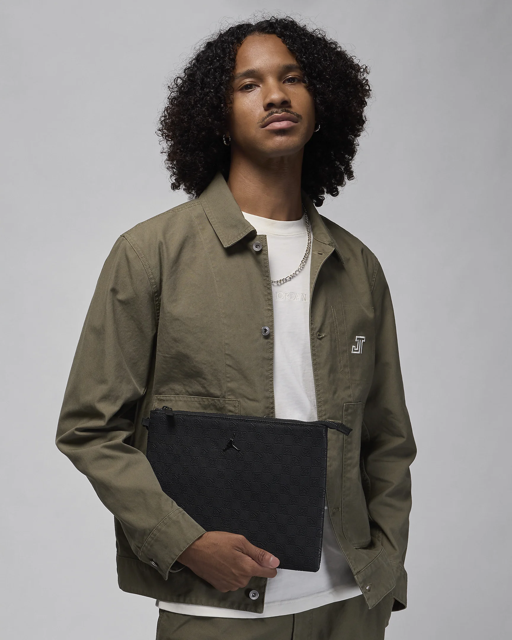 The classic pouch, with elevated Jumpman style. Made of animal-friendly faux leather finished with an allover debossed monogram pattern, this space-saving piece has a detachable wrist strap for versatile carry option. Benefits - The zippered main compartment has an inner slip pocket for cards, ID's and other smaller flat items. Product Details - 8.75"H x 12"L x 0.4"D; Strap Length: 7" - Main Body/Strap: 100% Polyurethane; Lining: 100% Polyester - Spot Clean - Imported - Shown: Black - Style: MM0989-023