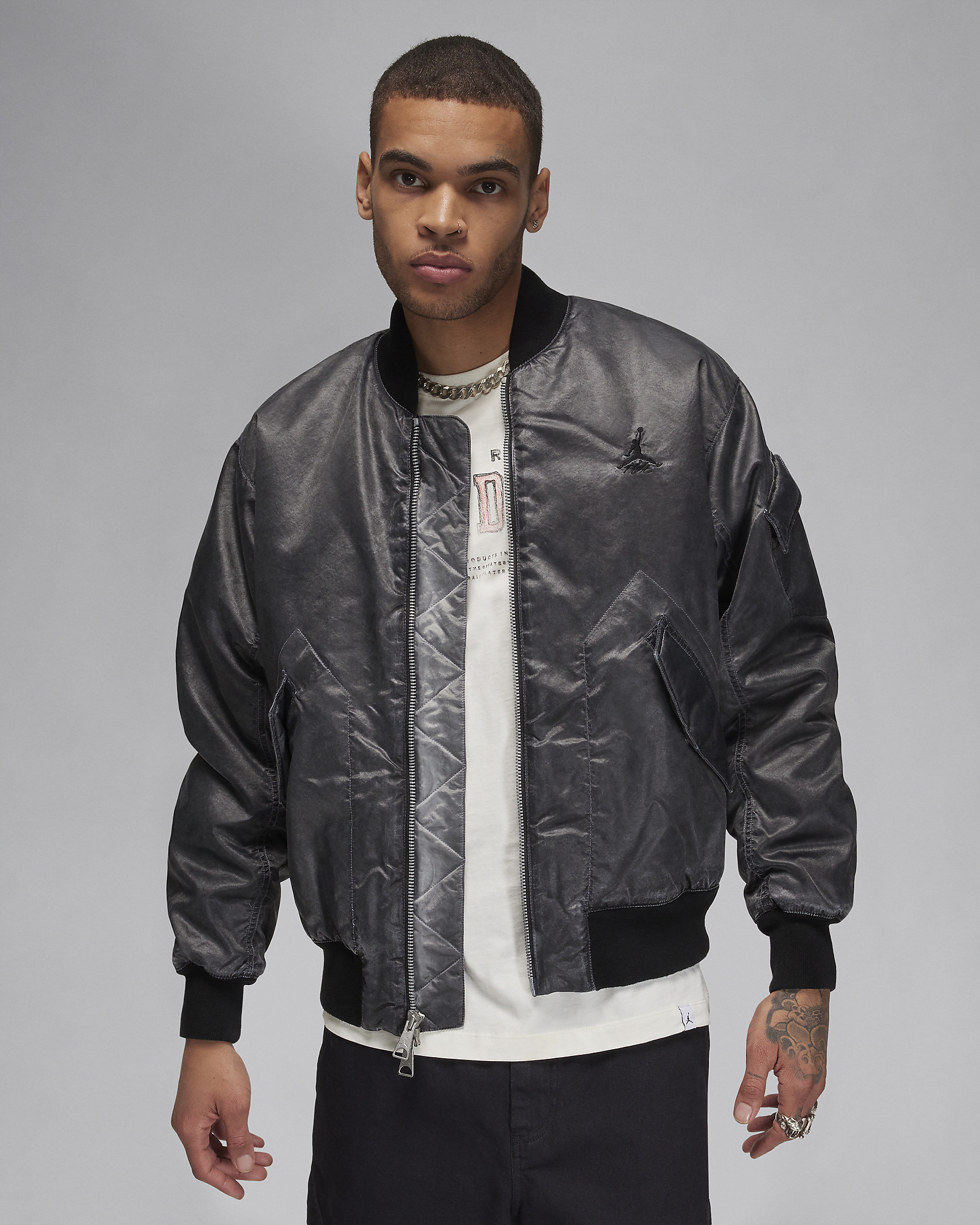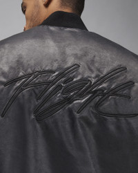 Classic bomber, Jordan style. This lightweight jacket looks substantial thanks to woven fabric (with just the right amount of shine) and synthetic insulation. Gusset construction on the back shoulders gives you room to move—without sacrificing the cut. Tonal branding and a subtle wash effect bring it home. Benefits - Snap closure pockets securely store your stuff. - Ribbing at collar, cuffs and hem helps keep the elements out. - Arm pocket provides extra storage. Product Details - Body: 100% Polyester; Lining: 100% Polyester; Fill: 100% Polyester - Machine wash - Imported - Shown: Black - Style: FN6543-010 SIZE & FIT Model is wearing size M and is 6′1″185cm Standard fit: easy and traditional
