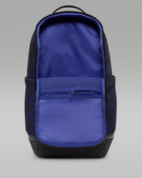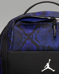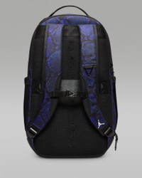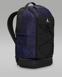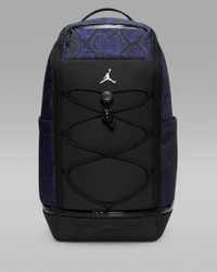 Carry your stuff in DNA style with this spacious Jordan backpack. The spacious main zippered compartment can hold books, a change of clothes or whatever else you need. The zippered compartment on the back is padded to help secure a laptop or tablet. Keep up with hydration by using the side bottle pockets, the laced bungee cord on the front can be used to hold something extra and the adjustable padded straps provide comfortable wear. What really puts this backpack over the top are the organizational pockets and the ventilated shoe garage at the bottom! Product Details - 20.5"H x 12.5"L x 8"D; Strap Length: 38" (longest), 19" (shortest) - 100% Polyester - Spot Clean - Imported - Shown: Purple Comet - Style: MA0945-P3E