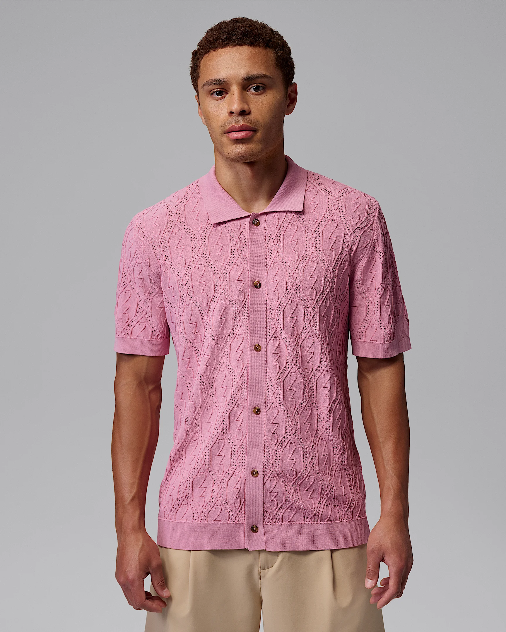 This button-down top is made for the links. Lightweight knit fabric helps you stay fresh through all 18 holes. And the look? It's Jordan style through and through. Product Details - 58% Viscose, 42% Nylon - Hand wash - Imported - Shown: Elemental Pink - Style: II7267-699 SIZE & FIT Model is wearing size M and is 6′2″188cm Standard fit: easy and traditional