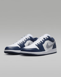 Inspired by the original that debuted in 1985, the Air Jordan 1 Low offers a clean, classic look that's familiar yet always fresh. With an iconic design that pairs perfectly with any 'fit, these kicks ensure you'll always be on point. Benefits - Encapsulated Air-Sole unit provides lightweight cushioning. - Genuine leather in the upper offers durability and a premium look. - Solid rubber outsole enhances traction on a variety of surfaces. - Shown: White/Midnight Navy/Wolf Grey - Style: 553558-141
