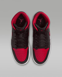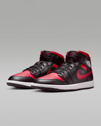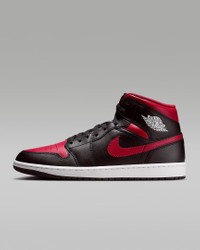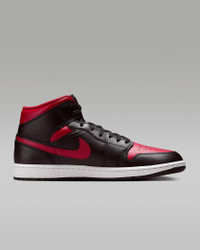 Inspired by the original AJ1, this mid-top edition maintains the iconic look you love while choice colors and crisp leather give it a distinct identity. Benefits - Leather, synthetic leather and textile upper for a supportive feel. - Foam midsole and Nike Air cushioning provide lightweight comfort. - Rubber outsole with pivot circle gives you durable traction. Product Details - Shown: Black/Summit White/Varsity Red - Style: DQ8426-067