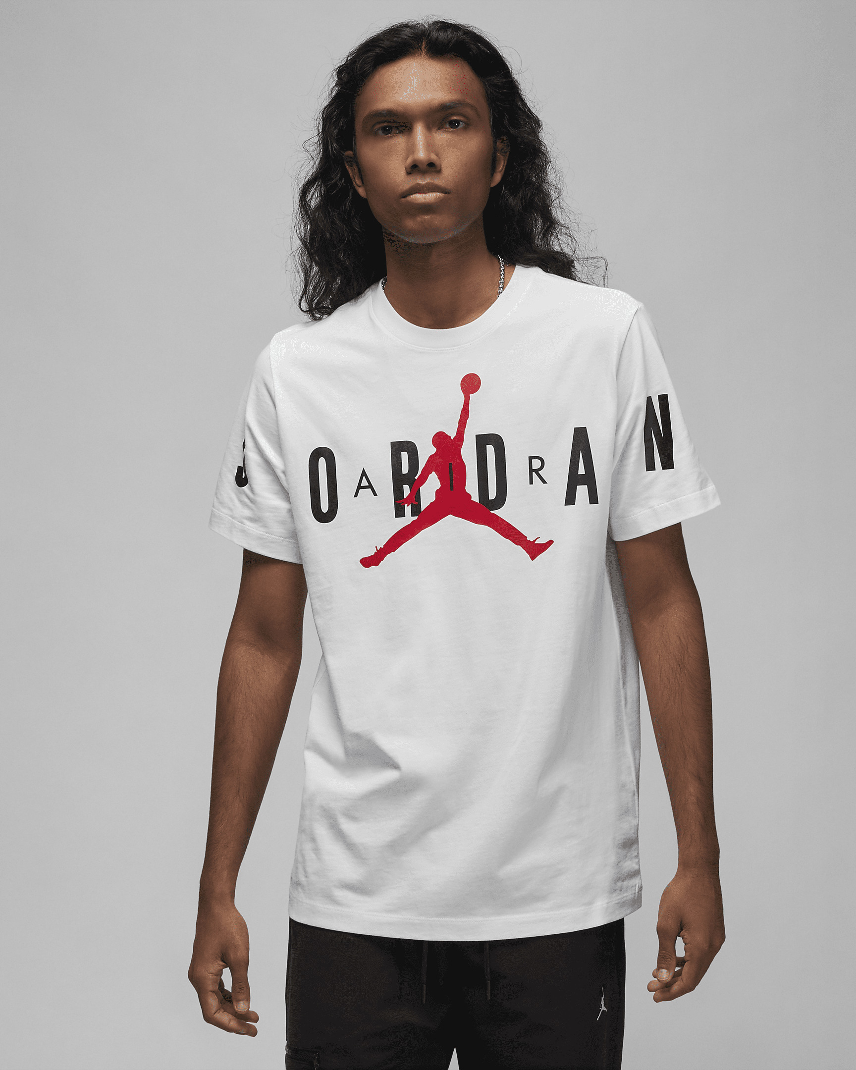 Show off your MJ pride with an extra-large print that covers your full wingspan, sleeve to sleeve. Printed on stretchy cotton, this is your new bold and comfortable go-to. Product Details - 100% cotton - Ribbed collar - Machine wash - Imported - Shown: White/Black/Gym Red - Style: DV1445-100 SIZE & FIT Model is wearing size M and is 6′3″191cm Standard fit: easy and traditional