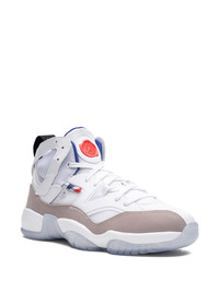 x PSG Jumpman Two Trey sneakers Jordan Brand and Paris Saint-German have updated the Jordan Two Trey sneakers with a Parisian colourway. This model features a high-top silhouette crafted from a mix of leather and suede panels in white, beige, red and blue hues. Underneath, an icy blue rubber outsole completes the look. Imported Composition Leather 100%