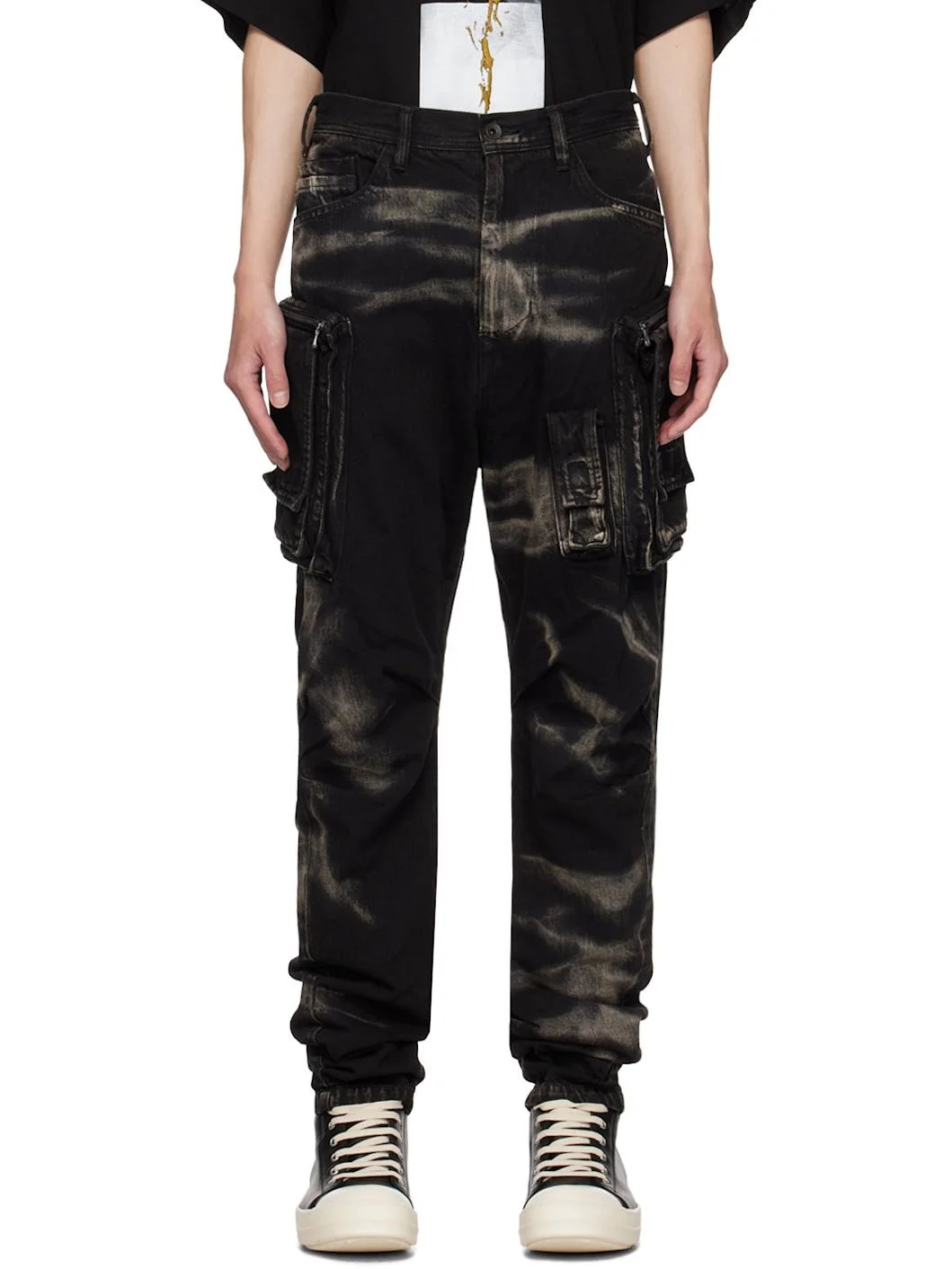 10 oz non-stretch denim cargo pants. Bleached effect throughout. · Belt loops · Seven-pocket styling · Zip-fly · Flap pocket at front · Pleats at knees · Zip cargo pocket at curved outseams Supplier color: Black 100% cotton. Made in Japan 242420M188002