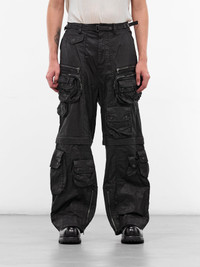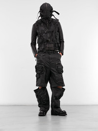 Featuring: • Baggy fit • Wide leg • Coated finish • Belt loops • Adjustable cinch straps • Concealed zip fly • Inset pockets • Front and back flap pockets • Various cargo pockets throughout leg • Zip paneling at knee • Zip vents and straps at hem • Made in China • 100% Cotton • Japanese sizing Model is 6'4" wearing size 3. Shoulders: 18" Chest: 36" Waist: 28"