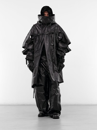 Featuring: • Baggy fit • Cotton-nylon construction with coated finish • Black color • Layering and cut-outs throughout • Belt loops and adjustable cinch straps • Front button and concealed zip fly closure • Side pockets and back flap pockets • Adjustable buckled straps • Paneling and vents along leg • Wide leg silhouette • Made in Japan • 65% Cotton 35% Nylon • Japanese sizing Model is 6'0" wearing size 3. Shoulders: 17" Chest: 30" Waist: 28"