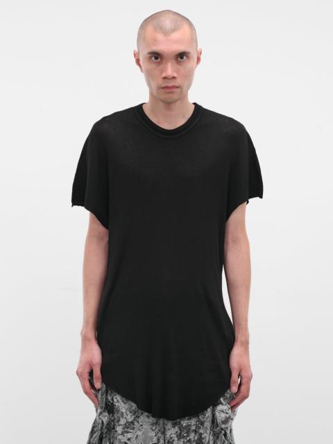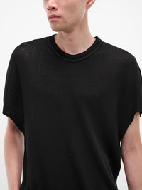 Black cotton-silk T-shirt with slim silhouette. Featuring: • Slim fit • Cotton-silk construction • Semi-sheer rib-knit • Crewneck • Short sleeves • Raw curved hemline • Longline length • Made in Japan • 80% Cotton 20% Silk • Japanese sizing Model is 6'0" wearing size 3. Shoulders: 17" Chest: 30" Waist: 28"