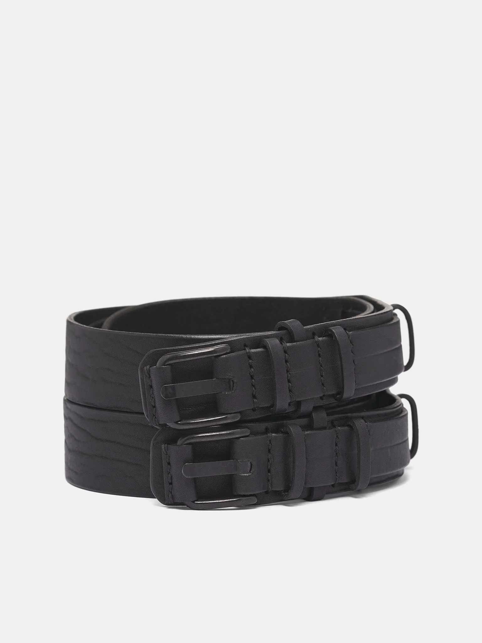 A black cow leather belt with a double-width layered design. The distressed texture and pin-buckle closure lend a rugged, deconstructed edge. Featuring: • Adjustable fit • Double-width leather construction • Worn effect • Layered leather detailing • Pin-buckle fastening • Made in Japan • 100% Cow Leather • One size