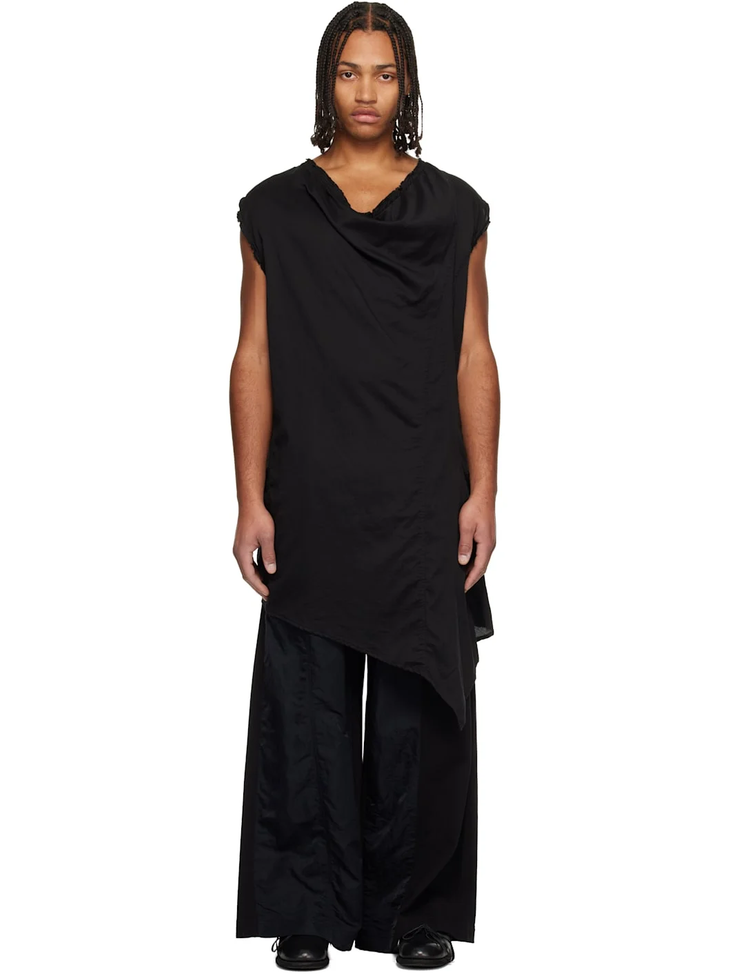 Cotton- and silk-blend twill T-shirt. · Draping throughout · Frayed edge at cowl neck and armscyes · Asymmetrical hem Supplier color: Black 95% cotton, 5% silk. Made in Japan 252420M213008