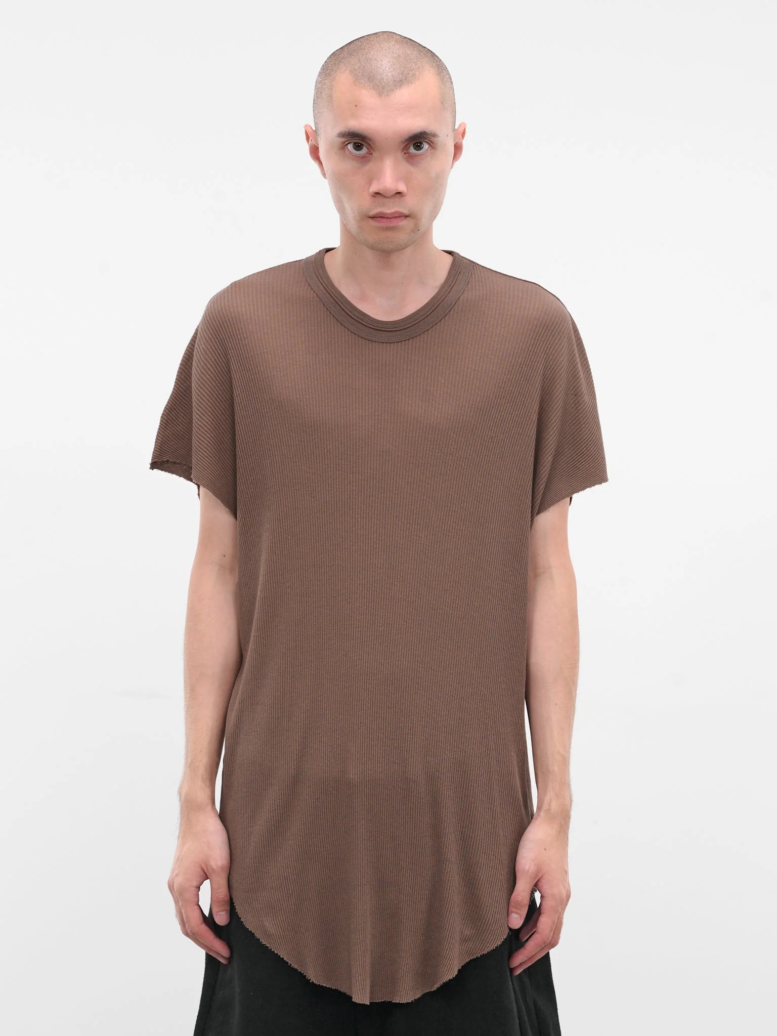 'Sand' brown cotton-silk T-shirt with slim silhouette. Featuring: • Slim fit • Cotton-silk construction • Semi-sheer rib-knit • Crewneck • Short sleeves • Raw curved hemline • Longline length • Made in Japan • 80% Cotton 20% Silk • Japanese sizing Model is 6'0" wearing size 3. Shoulders: 17" Chest: 30" Waist: 28"
