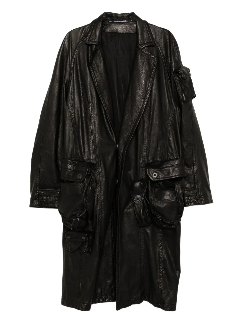 Gas Mask coat Highlights - Black - Front press-stud fastening - Two front cargo pockets - Sleeve flap pocket Imported Composition Lining: Cupro 63%, Cotton 37% Outer: Calf Leather 100% Washing instructions Do Not Wash/Do Not Dry Clean