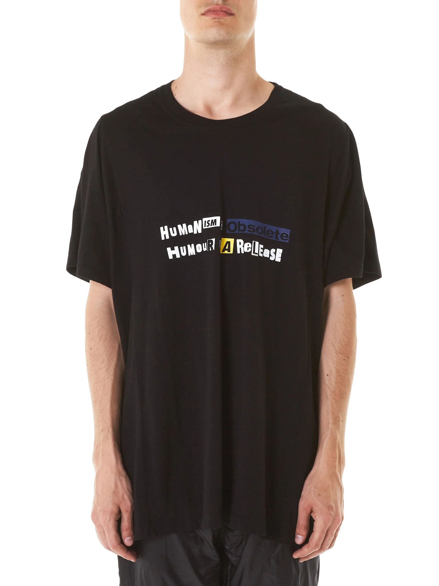 Crewneck t-shirt in black featuring graphic ransom style lettering at the front, a six-piece panel construction, straight hem, and tonal stitching throughout. 50% Cotton, 50% Modal Model wears a size 1.