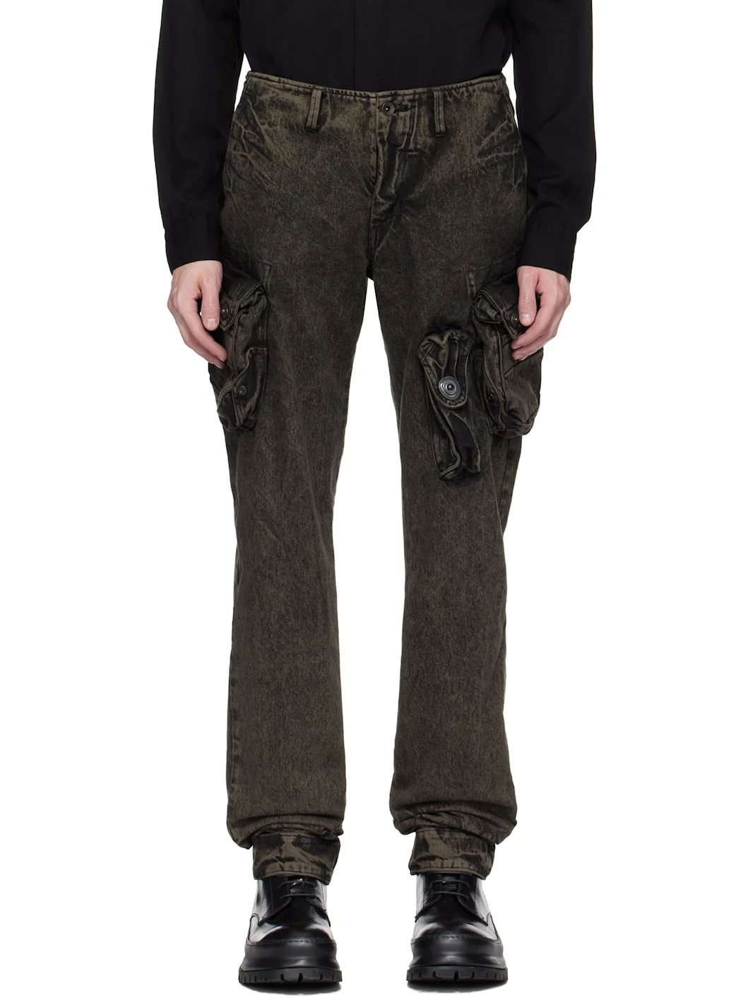 Skinny-fit coated 12 oz non-stretch denim cargo pants. Fading and whiskering throughout. · Overdyed · Belt loops · Four-pocket styling · Zip fly · Bellows pockets Part of the Permanent collection. Supplier color: Charcoal 100% cotton. Made in Japan 251420M188005