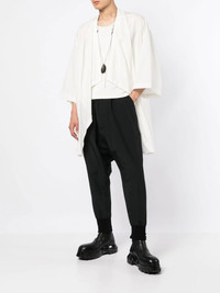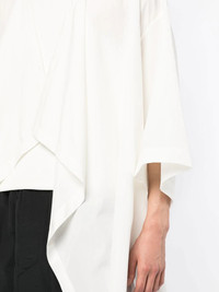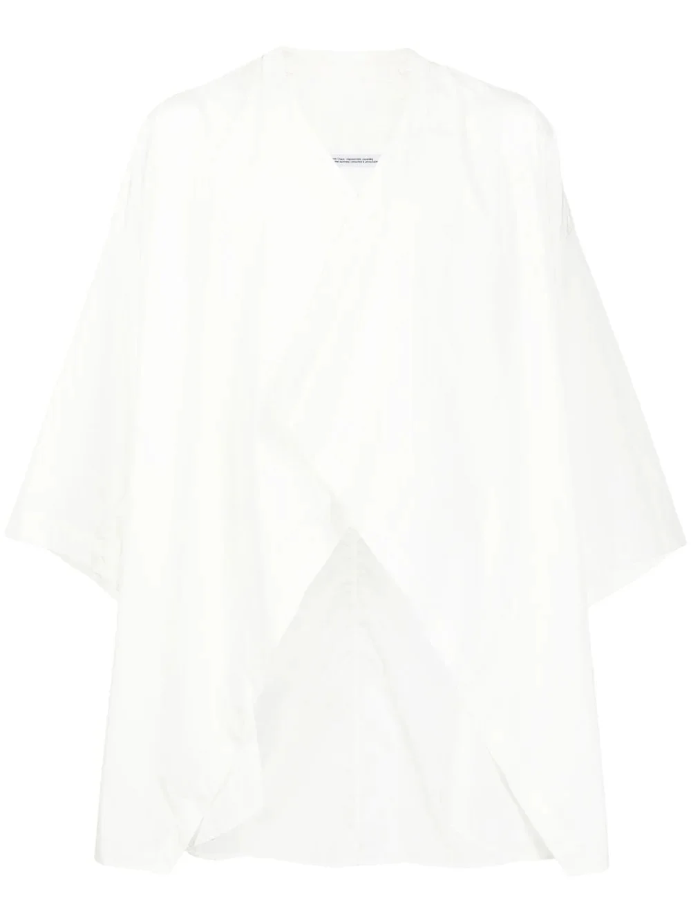 Haori Japanese cotton shirt off-white cotton draped design tonal stitching V-neck no fastening three-quarter length draped sleeves high-low hem Imported Composition Cotton 100% SIZE & FIT Model measurements Height 6 ft 2 in(1.87 m) Bust/Chest 34.25 in(87 cm) Hips 36.22 in(92 cm) Waist 29.52 in(75 cm) FittingInformation This piece fits true to size. We recommend you get your regular size Cut for an oversized fit Made with a lightweight non-stretch fabric Washing instructions Hand Wash