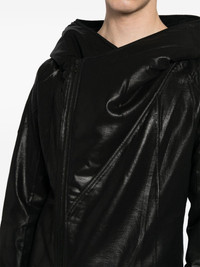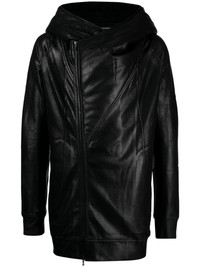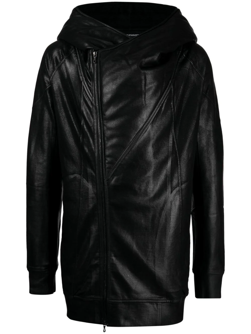 off-centre faux-leather jacket Highlights - Black - Cotton blend - Faux leather - Padded design - Classic hood - Crossover neck - Off-centre front zip fastening - Long raglan sleeves - Straight hem Imported Composition Cotton 95%, Polyurethane 5% Outer: Cotton 100% Filling: Polyester 100% SIZE & FIT Model measurements Height 6 ft 2 in(1.89 m) Bust/Chest 37.4 in(95 cm) Hips 36.61 in(93 cm) Waist 28.34 in(72 cm) FittingInformation Designed for a slim fit, offering a comfortable fit that sits just away from the body The ribbed hem offers a close, comfortable fit Made from a heavyweight non-stretch fabric This piece fits true to size – take your usual size