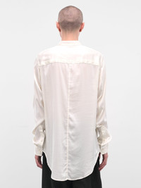 Off-white silk-satin shirt with relaxed cut. Featuring: • Relaxed fit • Silk-satin construction • Pointed collar • Concealed button placket closure • Long sleeves with button cuffs • Shirttail hem • Made in Japan • 95% Silk 5% Polyurethane • Japanese sizing Model is 6'0" wearing size 3. Shoulders: 17" Chest: 30" Waist: 28"
