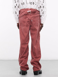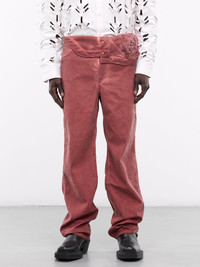 JUNTAE KIM pants in orange, paneled cotton construction, faded, cinch strap, flower embellishment, logo tag, fold-down waist, concealed zip fly closure, back patch pockets, logo flag, straight leg, regular fit. Made in South Korea 100% Cotton Standard Sizing Model is 5'11" wearing size L. Shoulders: 19" Chest: 38" Waist: 30"