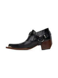 Ankle-high buffed leather buckled boots in black. · Pointed square toe · Cutouts at vamp · Pin-buckle ankle strap with engraved hardware · Elasticized gusset at sides · Stacked leather heel with rubber injection · Leather sole · Antiqued silver-tone hardware · Heel: H2.5 in Supplier color: Black Leather. Made in South Korea 231092M228000