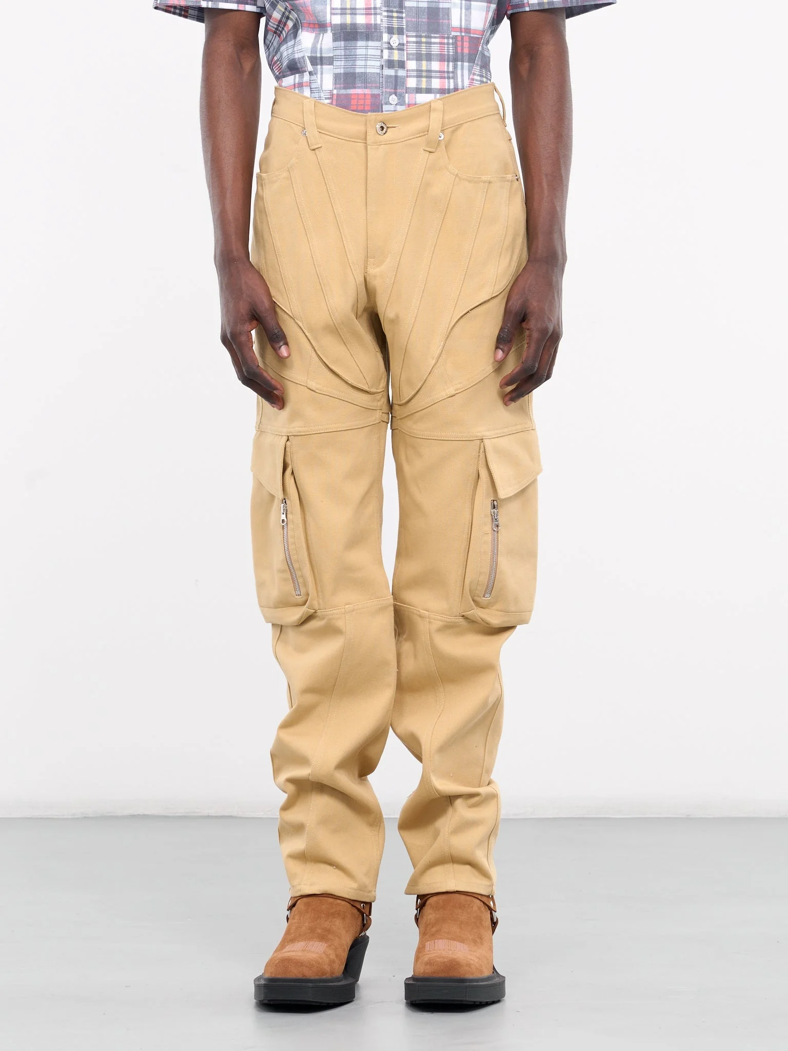 JUNTAE KIM pants in beige, utilitarian cargo design, paneled cotton construction, belt loops, back logo patch, front button & concealed zip fly closure, inset pockets, back patch pockets & logo flag, paneled detailing, side cargo pockets & zips, tapered leg, slim fit. Made in South Korea 100% Cotton Standard Sizing Model is 6’2” wearing size M. Shoulders: 19” Chest: 38” Waist: 28”