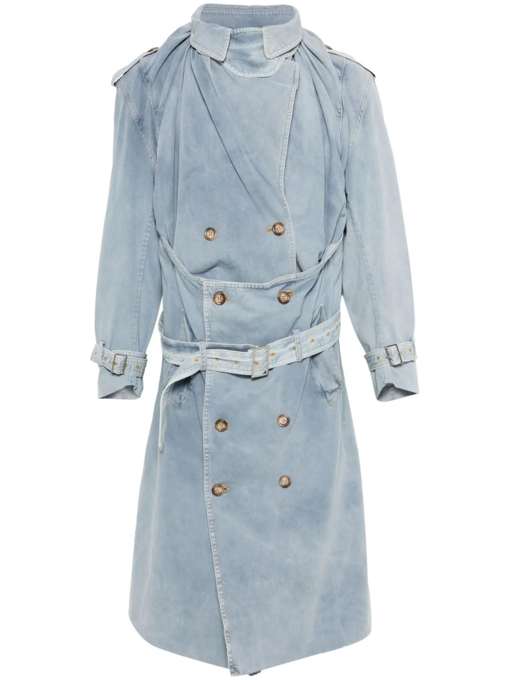 Corset trench coat Highlights - Pastel blue - Double-breasted button fastening - Two side welt pockets - Rear slit - When buying this unisex item, keep in mind that it is graded in standard men's sizing. Imported Composition Outer: Cotton 100% Lining: Polyester 65%, Cotton 35% SIZE & FIT Model measurements Height 5 ft 11 in(1.8 m) Bust/Chest 31.49 in(80 cm) Hips 36.61 in(93 cm) Waist 24.4 in(62 cm) FittingInformation This unisex piece is designed for a loose fit whether you usually select women's or men's sizes The belt offers adjustability for fitted preferences Made from a midweight non-stretch fabric