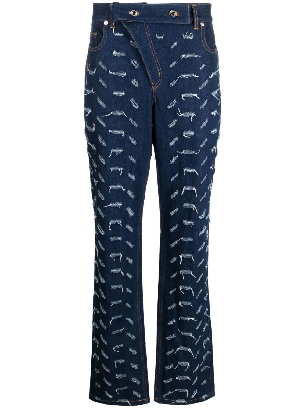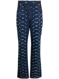high-waist bootcut jeans Highlights - Indigo blue - Cotton - Denim - Logo patch to the rear - Ripped detailing - Off-centre front button fastening - Bootcut - Classic five pockets Imported Composition Outer: Cotton 100% Lining: Polyester 65%, Cotton 35% SIZE & FIT Model measurements Height 6 ft 2 in(1.87 m) Bust/Chest 36.41 in(92.5 cm) Hips 35.43 in(90 cm) Waist 29.52 in(75 cm) Washing instructions Hand Wash