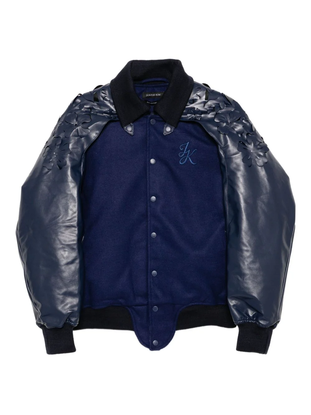 laser-cut flower jacket Highlights - Navy blue - Front press-stud fastening - Two front jetted pockets - Long sleeves - Ribbed cuffs and hem Imported Composition Outer: Polyester 80%, Rayon 20% Lining: Polyester 100% Washing instructions Hand Wash