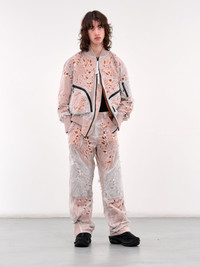 JUNTAE KIM jacket in grey & orange, paneled nylon construction, laser-cut petal graphic pattern, ribbed crewneck, front exposed two-way zip closure, long sleeves, sleeve zip pocket & logo flag, rib-knit cuffs & hem, side zip pockets & welt pockets, pointed hem, lined, oversized fit. Made in South Korea 100% Nylon Standard Sizing Model is 6'0" wearing size L. Shoulders: 18" Chest: 36" Waist: 30"