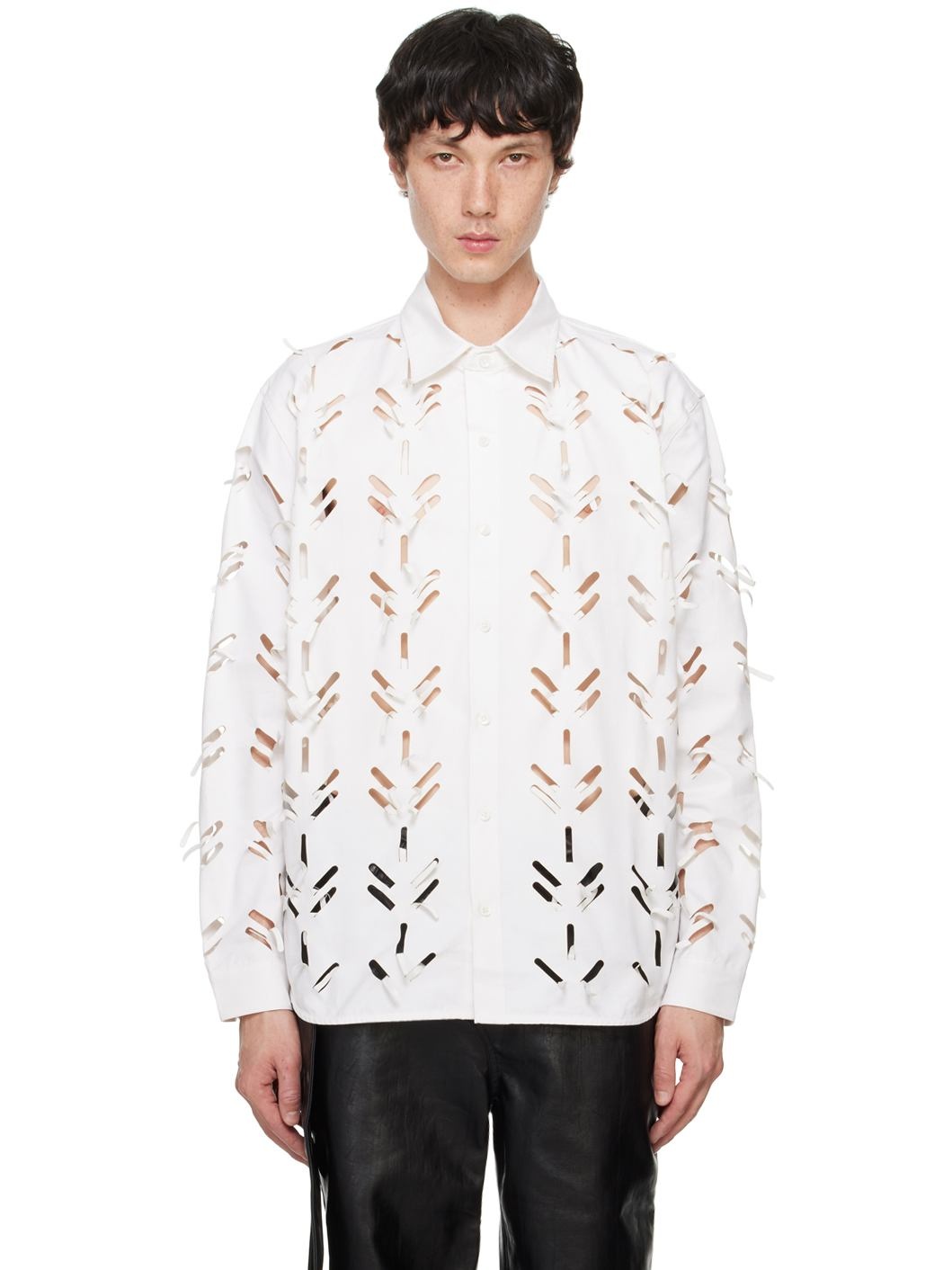 Cotton- and polyester-blend faille shirt. Smudging, cutouts, and fringed detailing throughout. · Spread collar · Button closure · Shirttail hem · Single-button barrel cuffs Supplier color: White
