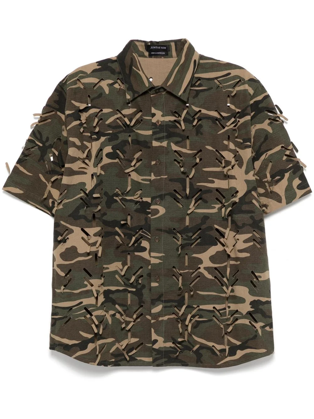 laser-slashed shirt Highlights - Olive green - Front button fastening - Cut-out detailing - Straight hem Imported Composition Cotton 100% SIZE & FIT Model measurements Height 6 ft 2 in(1.87 m) Bust/Chest 33.07 in(84 cm) Hips 35.43 in(90 cm) Waist 26.77 in(68 cm) FittingInformation Designed to be unstructured, offering a loose fit throughout Made from a midweight non-stretch fabric