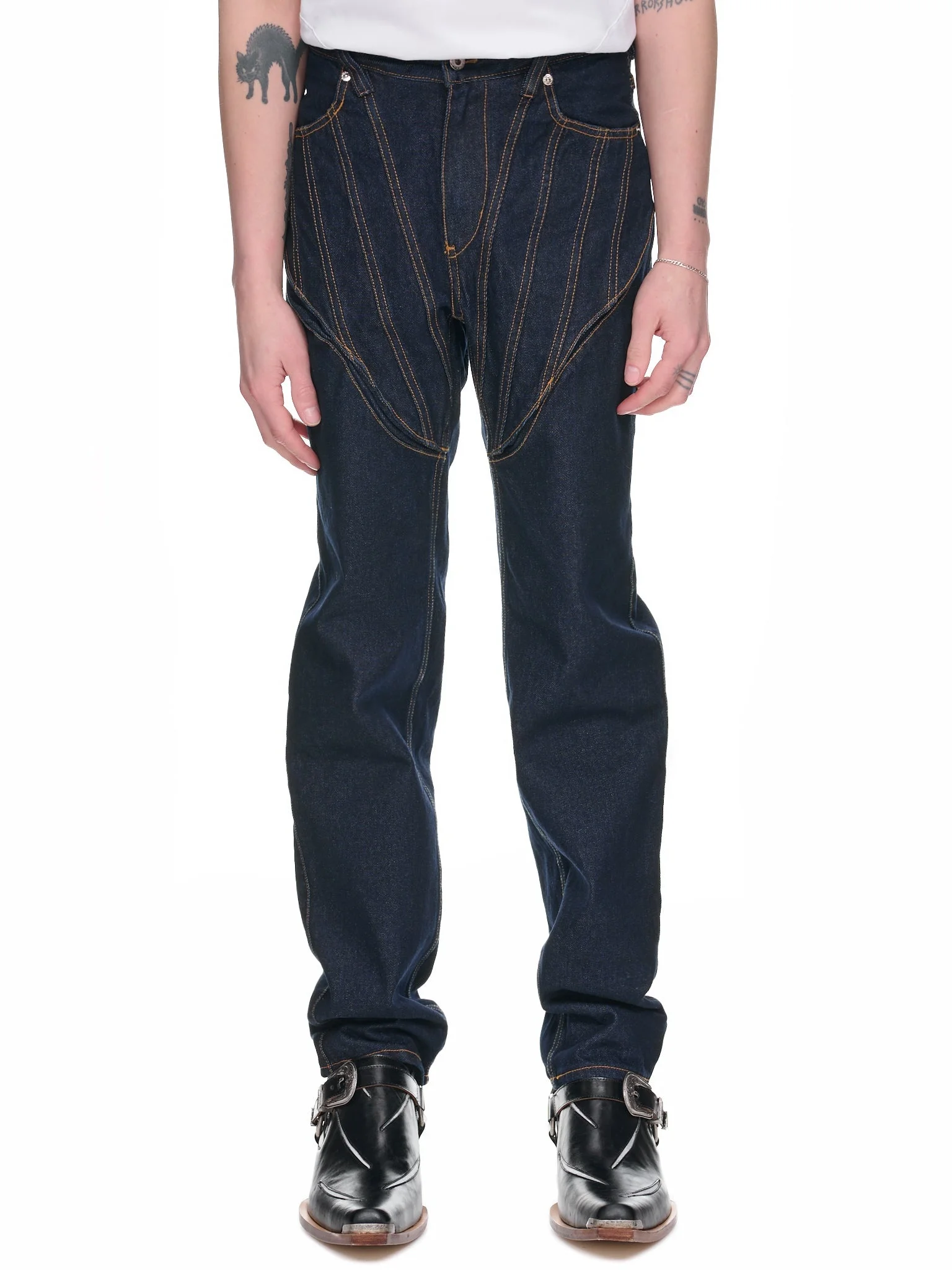 JUNTAE KIM jeans in blue, denim construction, seam details, mid-waist, belt loops, button zip-fly, four-pockets, contrast stitching, back embossed leather patch, slim fit. Made in South Korea Standard Sizing 100% Cotton Model is 5'11" wearing size S. Shoulders: 18" Chest: 34" Waist: 29"
