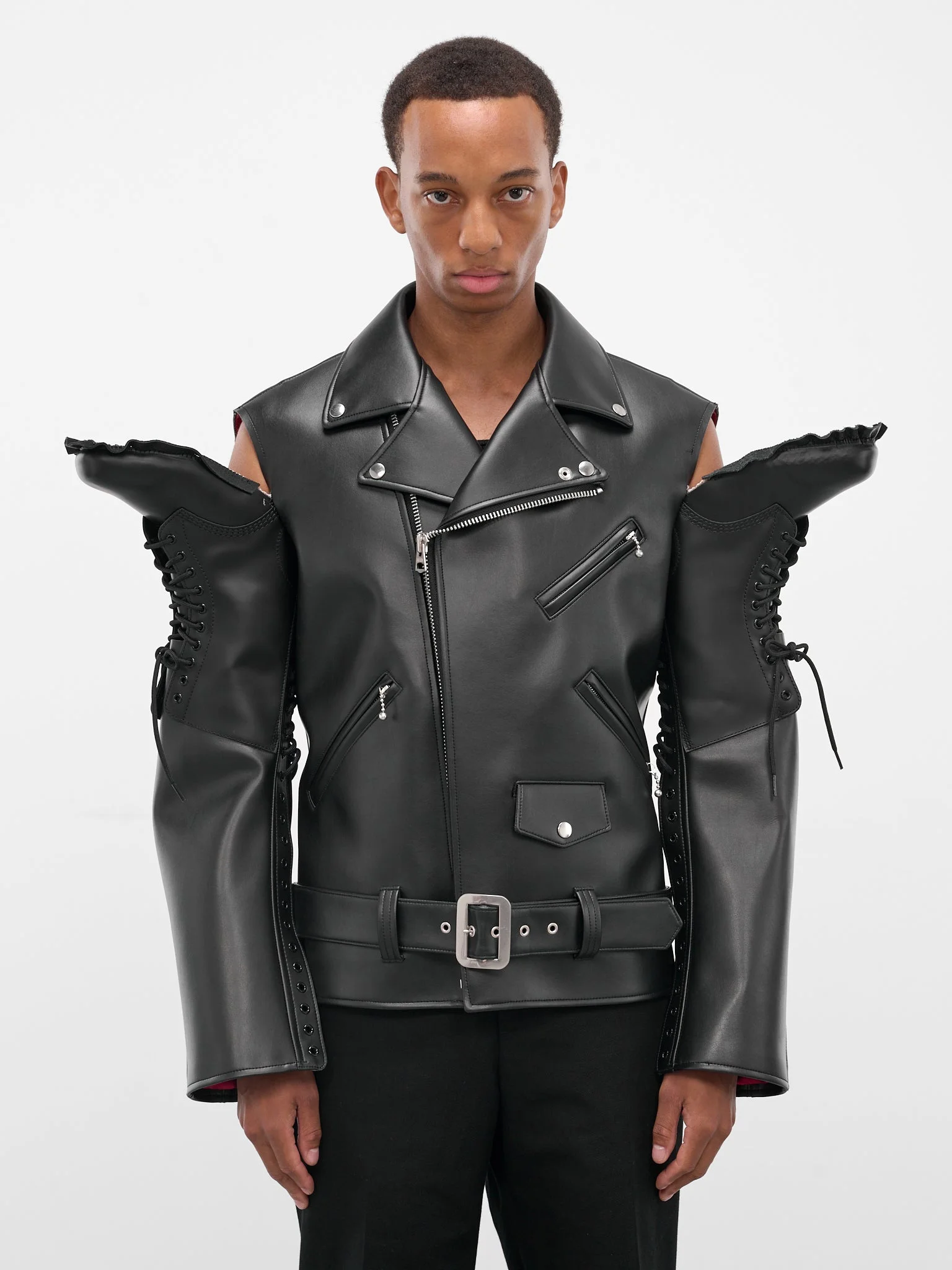 A black deconstructed jacket merging combat boots with a double-rider biker silhouette in vegan leather. Sculptural boot sleeves, lace-up eyelets, and toebox details create a hybrid form anchored by a pin-buckle belt and zipped pockets throughout. Featuring: • Slim fit • Deconstructed boots and double-rider biker jacket design • Vegan leather construction • Double-rider notched lapel • Double-breasted button closure • Shoulder cut-outs • Deconstructed combat boots as sleeves • Eyelets and lace-up detailing • Sculptural toeboxes • Zip vents at cuffs • Chest and side zip pockets • Front flap button • Belt loops and pin-buckle belt at waist • Made in Japan • 100% Synthetic leather • Standard sizing
