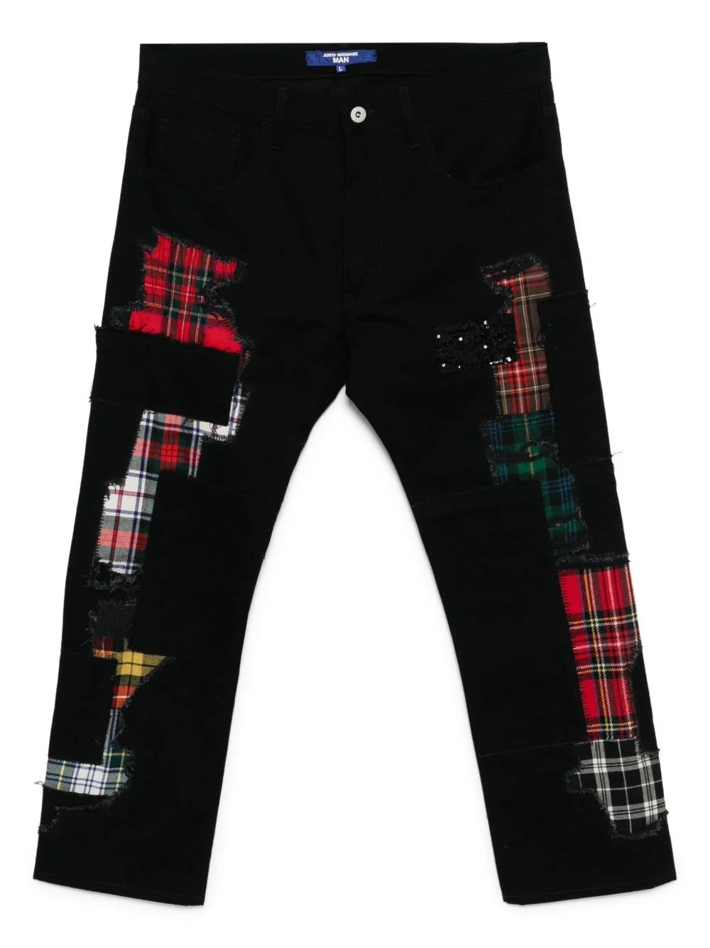 patchwork jeans Highlights - Black - Front button and zip fastening - Belt loops - Classic five pockets Imported Composition Cotton 57%, Wool 36%, Polyester 4%, Nylon 1%, Polyurethane 1%, Acrylic 1%